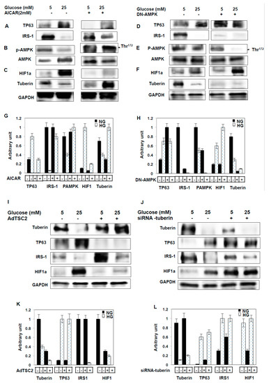 Activation of AMPK by AICAR decreases TP63 and increases IRS-1, and over-expression of tuberin resulted in decreased TP63 expression. MCT cells were treated with AICAR (2mM) or transfected with DN-AMPK. (A) AICAR treatment abolished TP63 expression significantly in NG and HG, while IRS-1 expression was decreased in NG and increased in HG. (B) AICAR treatment increased the expression of both p-AMPK and AMPK significantly. (C) AICAR treatment downregulated HIF1a expression in NG, and the expression of tuberin was downregulated significantly in both NG and HG. (D) DN-AMPK transfection significantly downregulated TP63 expression and increased IRS-1 expression. (E) DN-AMPK treatment downregulated expression of p-AMPK. (F) DN-AMPK transfection increased the expression of HIF1a greatly and significantly downregulated the expression of tuberin under both NG and HG conditions. (G,H) Histogram of the average expression of each protein presented as an arbitrary unit was calculated from each protein and normalized by GAPDH from 2 Western blots. (I,J) The overexpression of tuberin resulted in significant decreases in TP63 and greatly increased IRS-1 expression compared to non-infected cells under NG and HG conditions. In contrast, HIF1a is significantly downregulated with the overexpression of tuberin and increased with the siRNA-tuberin treated cells compared to non-infected cells under NG and HG conditions. (K,L) The average expression of each protein presented as an arbitrary unit was calculated from each protein and normalized by GAPDH from 2 Western blots.