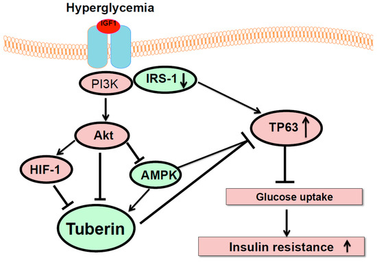The proposed model of TP63’s role in insulin resistance. Hyperglycemia decreases IRS-1 to activate Akt/HIF-1 and downregulate tuberin/AMPK. The downregulation of IRS-1 increases TP63 under high glucose to decrease glucose uptake, suggesting that TP63 may be involved in insulin resistance in diabetes.