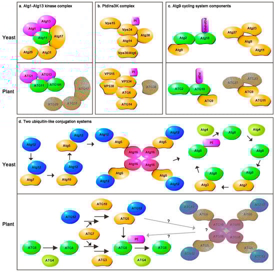 The comparison of yeast and Arabidopsis core autophagy components. (a) Atg1–Atg13 kinase complex. (b) The phosphatidylinositol 3-kinase (PtdIns3K) complex. (c) The Atg9 cycling system components. (d) The two ubiquitin-like conjugation systems. The unidentified components or complexes in plant are covered by grey.