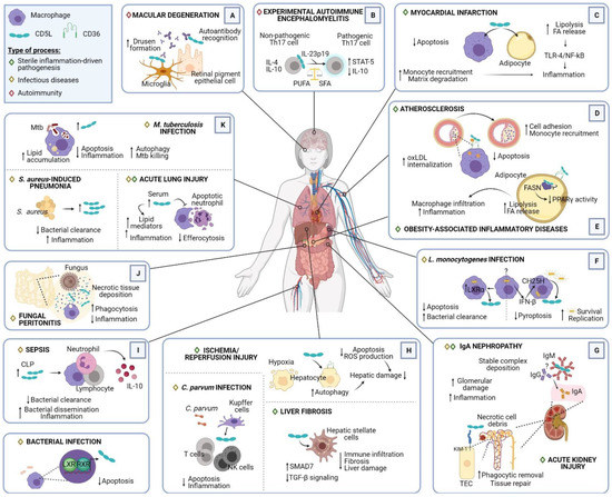 Multiple roles of CD5L in pathogenesis. Representative illustration summarizing the different scenarios in which CD5L plays a role, including its source, target cells, interacting proteins, and main outcomes. The processes have been classified into sterile inflammation-driven pathogenesis, infectious diseases, and autoimmunity, and have been grouped according to the affected region: (A) eye; (B) brain; (C) heart; (D) artery; (E) adipose tissue; (F) spleen; (G) kidney; (H) liver; (I) circulation; (J) peritoneum; (K) lung. ↓, decreased; ↑, increased. Abbreviations: HSC, hepatic stellate cells; TEC, tubular epithelial cells; NK, natural killer cells; ROS, reactive oxygen species, Mtb, M. tuberculosis; CH25H, cholesterol 25-hydroxylase; FA, fatty acids; FASN, fatty acid synthase; PUFA, polyunsaturated fatty acids; SFA, saturated fatty acids; LXR, liver-X-receptor; RXR, retinoid-X-receptor; CLP, cecal ligation puncture; UPR, unfolded protein response (figure created with Biorender.com).