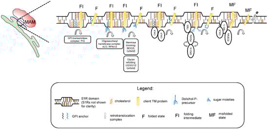 Proposed function of S1R microdomains in the endoplasmic reticulum (ER). S1R microdomains are formed in the ER membranes and enriched in MAMs. S1R microdomains are characterized by higher cholesterol content and thicker bilayer structure when compared to the rest of the ER membrane. In S1R domains, protein folding-modification machinery is compartmentalized and allows a protein to proceed from a folding intermediate (FI) state to a fully folded (F) state. Client proteins (shown here as a single transmembrane helix for simplicity), which can include ER resident proteins, components of extracellular matrix, and PM channels/receptors, are recruited to these clusters. Folding machinery include enzymes involved in the following processes: GPI transamidase complex (PIG) catalyzing the transfer of a GPI moiety to nascent protein chains; initial glycosylation steps (components of oligosacharyl transferase complex alpha-1,3/1,6-mannosyltransferase (ALG), recognition particle 1/2 (RPN1/2)), initial mannose trimming steps (MOGS, GANAB), and glycan refolding (UGGG1/2, GANAB); ER lectins involved in protein quality control and refolding (calnexin (CALX)/calreticulin (CALR)); oxidative folding enzymes (TMX and protein disulfide isomerases); and finally, quality control lectins guiding unfolded proteins for recognition by the ER-associated protein degradation pathway (ERAD). Agonists affect the S1R oligomerization state and result in partial disassembly of S1R domains, leading to release of proteins from S1R clusters.