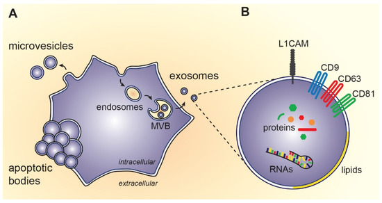 Biosynthesis and composition of extracellular vesicles: (A) Exosomes originate from endosomal compartment, i.e., intraluminal vesicles of multivesicular bodies (MVB). On the other hand, microvesicles arise by outward budding of cytoplasmic membrane and apoptotic bodies are formed during programmed cell death; (B) Exosomes contain proteins, RNAs, lipids and small molecules of the source cell. Some of the molecules specifically incorporated during exosome biosynthesis can be used as markers for exosome detection (e.g., transmembrane tetraspanins CD9, CD63, CD81) or as a marker of neuronal origin (e.g., L1 cell adhesion molecule, L1CAM).