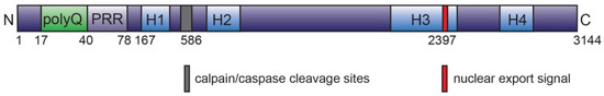 Overview of human huntingtin protein. Full-length HTT consists of 3144 amino acids, with a total molecular mass of 350 kDa. The N-terminal 17 amino acid region carries several post translational modification sites (such as acetylation, SUMOylation, phosphorylation, ubiquitination, etc.) and is followed by polyglutamine tract (polyQ; expanded in Huntington’s disease), proline rich region (PRR), HEAT repeat domains (H1-H4; the HEAT corresponds to proteins, where they were first described: huntingtin, elongation factor 3 [EF3], protein phosphatase 2A [PP2A], and the yeast kinase TOR). Leucine-rich nuclear export signal is located at the C-terminal region. The protein may undergo post translational modifications and/or protease cleavage on several sites, e.g., caspase-6 cleavage at aspartate 586 [50,72,75,76,77].