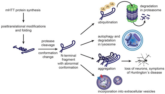 Formation of mHTT toxic species and cellular mechanisms to handle them. Mutant huntingtin protein carrying expanded polyglutamine sequence is prone to adopt abnormal conformation. Post translational modifications and protease cleavage may contribute to formation of misfolded N-terminal fragments. Molecular chaperones, such as Heat Shock Proteins, participate in re-folding of misfolded proteins. Once unsuccessful, the resulting misfolded proteins can be degraded by ubiquitin-proteasome system or autophagy. Accumulation of misfolded mHTT rich in β-sheet structure leads to aggregate formation, loss of neurons and Huntington’s disease symptoms. Misfolded proteins may be eliminated from neurons also by exosomal secretion [86,87,88].