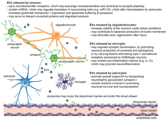 In the CNS, exosomes play essential physiological roles in the cell to cell communication and homeostasis maintenance required for normal brain function [92], particularly in neurogenesis [92,93,94,95], in synaptic activity and plasticity [96], myelination [88], and protection and regeneration of neuron after injury and disease [97,98,99] (Figure 4). EVs are released by neural cells including neurons, astrocytes, microglia, and oligodendrocytes [92,93,100] under both normal and pathological conditions. In human CNS, EVs have been isolated from the cerebrospinal fluid (CSF) and from adult brain [101,102]. The cellular origin of the neuronal secreted exosomes can be assessed by the presence of the GPI-anchored prion protein, cell adhesion molecule L1, and subunits of glutamate receptors [103,104].