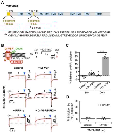 Previous studies have reported that TMEM16A splice variants possessing c-segments showed relatively higher sensitivity to intracellular Ca2+ concentrations [22,23]. Here, we used two TMEM16A isoforms that had an a-segment only or both the a- and c-segments (Figure 1A). Using the zebrafish voltage-sensing phosphatase (Dr-VSP), we first investigated how the splice variant TMEM16A(ac) responded to PI(4,5)P2 regulation. Lipid phosphatase was activated by the depolarization of the membrane potential and quickly removed the 5-phosphate from PI(4,5)P2 [24,25]. In the control experiments without Dr-VSP, there was no significant difference in the peak plateau current amplitudes (blue arrowhead) before (Trace a) and after (Trace b) a 1 s depolarization to +120 mV for both the TMEM16A(a) and TMEM16A(ac) currents. The strong depolarizing pulse attenuated the subsequent TMEM16A(ac) current by 23 ± 1% in cells expressing Dr-VSP (Figure 1B,C). However, it did not significantly attenuate the TMEM16A(a) current. To test whether the inhibition of TMEM16A(ac) by Dr-VSP was caused by PI(4,5)P2 depletion, the effect of Dr-VSP activation was measured in cells co-expressing PIP 5-kinase type-1γ (PIPKIγ), which accelerates synthesis and elevates the PI(4,5)P2 concentration in the cell membrane [26]. Co-expression with PIPKIγ almost completely abolished the current inhibition induced by 1-s Dr-VSP activation (Figure 1B,D).