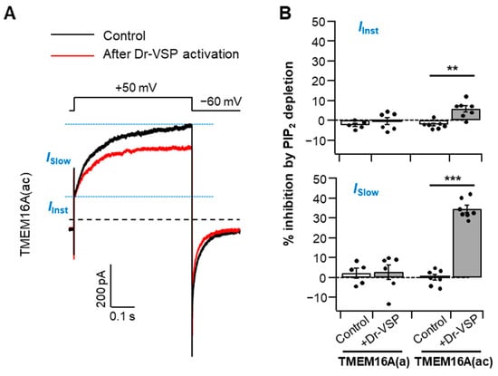 Under moderate intracellular Ca2+ levels, TMEM16A activation traces can be divided into two conductance phases: a small, rapid, instantaneous current (IInst) and a slowly activating current (ISlow) with a subsequent steady-state level [23,27,28]. To identify whether both the instantaneous and slow components of the TMEM16A current are manipulated by PI(4,5)P2 regulation, we analyzed the PI(4,5)P2 depletion-mediated current suppression in the two gating phases in the presence of 115 nM cytosolic Ca2+ (Figure 2A). We found that the current reductions in TMEM16A(ac) by PI(4,5)P2 depletion were 5 ± 1% and 34 ± 1% in instantaneous and slow currents, respectively (Figure 2B), indicating that the two phases have different sensitivities to PI(4,5)P2 and that PI(4,5)P2 regulation is much more prominent in the slower steady-state currents (ISlow) of TMEM16A(ac). No significant differences were observed for TMEM16A(a) between the two components (Figure 2B).
