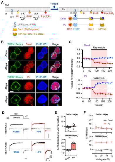 To further investigate the effects of PI(4,5)P2 on TMEM16A currents in living cells, we applied the rapamycin-inducible translocation system. In this system, rapamycin forms a ternary complex with FKBP (FK506 binding protein) and FRB (the rapamycin-binding domain of mTOR). Here, we used the fusion proteins of mRFP-FKBP (RF) with two lipid phosphatase enzymes [29]; 4-phosphatase (Sac1) dephosphorylates PI4P at Position 4 of the inositol ring and inositol pholyphosphate-5-phosphatase E (INPP5E) dephosphorylates PI(4,5)P2 at Position 5 of the inositol ring. By combining either the inactive or active forms of each enzyme, there were 2 constructs, as in Figure 3A: RF-Dead, with no activity, and pseudojanin (PJ), with both Sac1 and INPP5E phosphatase. Upon the application of rapamycin, these proteins can be recruited to a plasma membrane anchor Lyn11-FRB comprising LDR and the 11 N-terminal sequences of Lyn kinase (including its myristylation and palmitoylation sites and basic amino acids) coupled to an FRB domain [29]. To monitor the specific enzymatic activity of the translocatable phosphatase, we used a genetically expressed fluorescent PI(4,5)P2 probe, the pleckstrin homology (PH) domain from PLCδ1 (CFP-PH-PLCδ1). The CFP-PH-PLCδ1 probe marks PI(4,5)P2 at the plasma membrane in resting cells and migrates into the cytosol when PI(4,5)P2 is depleted. The translocation of RF-PJ (but not RF-Dead) by rapamycin selectively initiated the migration of the PI(4,5)P2 probe, which is visible as an increase in the fluorescence intensity in the cytosol (blue trace in Figure 3B,C). These results are consistent with the consequences published previously [30].