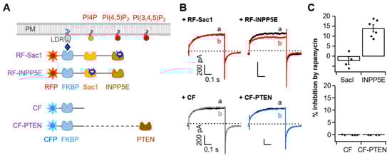 In addition to PI(4,5)P2, other phosphoinositides such as PI4P or PI(3,4,5)P3 have been reported to modulate the activity of ion channels [31,32,33,34]. To validate phosphoinositide specificity in TMEM16A, we further performed experiments with diverse rapamycin-induced dimerization systems labeled with either active Sac1, INPP5E, or PTEN (a phosphatase and tensin homolog) that selectively de-phosphatize PI4P, PI(4,5)P2, and PI(3,4,5)P3, respectively (Figure 4A). We found rapamycin to have no effect on the TMEM16A current in cells expressing RF-Sac1 (Figure 4B, top). However, rapamycin-induced recruitment of RF-INPP5E decreased the TMEM16A current by 14 ± 1% (Figure 4B,C, top), which suggests that PI4P is unable to regulate TMEM16A activity. For PI(3,4,5)P3, both the control CFP-FKBP (CF) and CFP-FKBP-PTEN (CF-PTEN) showed no changes in TMEM16A current after rapamycin application (Figure 4B,C, bottom). The results regarding the PI(3,4,5)P3 effects are consistent with the observations by the Tian group, who found that siRNA knockdown of PTEN or PI3-kinase inhibition by wortmannin did not affect TMEM16A activation by ionomycin [35]. Collectively, our results provide evidence that among the membrane phosphoinositides, PI(4,5)P2 specifically affects the activation of TMEM16A in living cells.