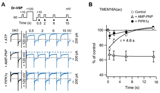 Next, we tested whether recovery from Dr-VSP-induced inhibition requires PI(4,5)P2 resynthesis. The rate of recovery was measured with a voltage protocol reported previously [36]. The control channel current was measured by a +50-mV test pulse and the recovery after the activation of Dr-VSP was as shown in the protocol (Figure 5A). The TMEM16A(ac) current recovered to the initial level with a time constant (τ) of 4.6 s. However, recovery was almost completely blocked in cells perfused with the nonhydrolyzable ATP analog AMP-PNP (Figure 5B). In the cells co-expressing PIPKIγ, the current inhibition of TMEM16A(ac) was dramatically reduced. The prevention of recovery by AMP-PNP and the prevention of inhibition by overexpressed PIPKIγ confirmed that TMEM16A(ac) needs PI(4,5)P2 for maximal activation and PI(4,5)P2 resynthesis for recovery from Dr-VSP-induced inhibition.