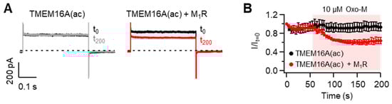 Modulation of TMEM16A(ac) channels by the M1 muscarinic receptor (M1R). (A) Representative Cl− current traces of TMEM16A(ac) before and after application of the M1R agonist oxotremorine-M (Oxo-M). Whole-cell recordings were measured before (t0, black) and 200 s after (t200, gray and red) the application of 10 μM Oxo-M in cells co-transfected without (left) and with (right) M1R. Cells were dialyzed with an intracellular solution including 10 mM EGTA and zero Ca2+, and the current was measured at +100 mV every 5 s. (B) Normalized mean current ± SEM. TMEM16A(ac), n = 5; TMEM16A(ac) + M1R, n = 5.
