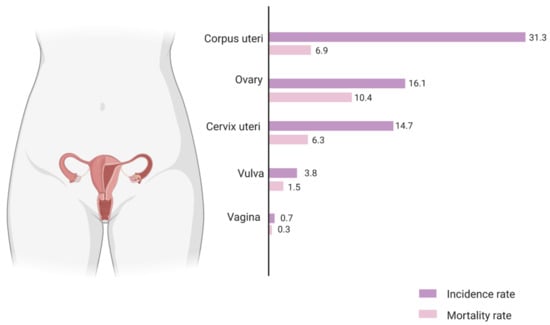 Population-based cancer incidence and mortality data is compiled by various organisations across the world. For Europe, the European Cancer Information System estimates an age standardised incidence rate of ovarian cancer at 16.1 per 100,000 and an associated mortality rate of 10.4 per 100,000 (Figure 1) []. This high mortality-to-incidence ratio is attributable to a combination of late detection and resistance to therapy. The improbability of early diagnosis is a direct consequence of the lack of specific symptoms during the early stages of the disease, as well as the absence of reliable screening strategies. Owing to the success of cervical and breast cancer screening, as well as the rather modest increase in survival from improved treatment, there have been fervent efforts to boost ovarian cancer survival via screening using CA125, an epitope of MUC16, a large glycoprotein marker. However, the accuracy of this biomarker is still questionable, although more effective screening strategies with CA125 are being developed []. As outlined before, therapeutic advances have led to only a small increase in ovarian cancer survival rate over the years. Standard treatment for ovarian cancer is cytoreductive surgery along with combination taxane–platinum-based chemotherapy. More recently, the two most promising novel therapeutic approaches are using monoclonal antibodies such as bevacizumab, targeting tumour microenvironmental pathways such as angiogenesis, and inhibitors of the poly (ADP-ribose) polymerase (PARP) enzyme which is involved in critical cellular functions such as DNA repair. Both have been approved by the FDA and show promising outcomes as combinatorial and maintenance drugs in ovarian cancer [].