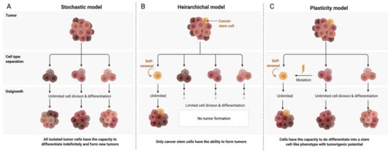Models of ovarian cancer tumor development and heterogenity. (A) The stochastic model—Each cell is considered biologically equivalent (clonal). Heterogeneity is attributed to genetic mutations propagated through time. All cells have tumorigenic capacity. (B) The hierarchical model—A single cell undergoes a de-differentiating mutation and forms a distinct subpopulation within the niche having stem cell-like tumorigenic potential and leading to the formation of both intermediate progenitor cells as well as terminally differentiated cells, thus contributing to heterogeneity. (C) The plasticity model—Proposes a plastic state of tumorigenic potential in the niche. Differentiated cells can be mutated to re-acquire stem cell-like properties, and the niche contains a dynamic heterogeneous population of differentiated tumour cells as well as stem cells.