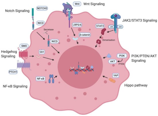 Notch3 has been found to be overexpressed in high-grade serous ovarian cancer (HGSOC) []. In ovarian cancer cell lines, Notch3 overexpression causes upregulation of pathways associated with stem cell generation. Treatment of ovarian cancer cells with notch pathway inhibitors was found to deplete stem cells and when administered in combination with cisplatin, it eliminated the stem cell population as well as the tumour cells []. The Wnt pathway has been implicated in the ovarian cancer stem cell niche. Specific G-protein-coupled receptors have been associated with Wnt pathway regulation of stem cells in the ovary []. Downstream β-catenin activation leads to upregulation of ABC transporters, which have been linked to the development of taxane–platinum therapy resistance []. PTCH1 and Gli1 transcription factors associated with the Hedgehog pathway have also been found to be overexpressed in ovarian cancer patients and correlate with poor prognosis and survival []. The effector protein of the Hippo pathway, YAP, is a known oncogene in ovarian cancer []. Inhibition of YAP causes in vitro and in vivo suppression of platinum therapy resistance []. The PI3K/PTEN/AKT pathway is also activated in HGSOC. PI3K inhibition was found to chemosensitise resistant ovarian cancer patients to platinum-based therapy []. Patient-derived CD24+ OCSCs showed increased expression of STAT3, and inhibition of the JAK2/STAT3 pathway correlated with better survival []. Taxane and JAK2 inhibitor combination therapy was found to cause a decrease in ovarian cancer stemness []. The NF-κB pathway has been implicated in the formation of stem cells []. Tumorigenic and stemness-initiating properties were verified in a mouse xenograft model-based study which found that stemness was maintained via both canonical and non-canonical cascades of the NF-κB pathway. Inhibition of the pathway restored sensitivity and response to platinum therapy in ovarian cancer cells [].