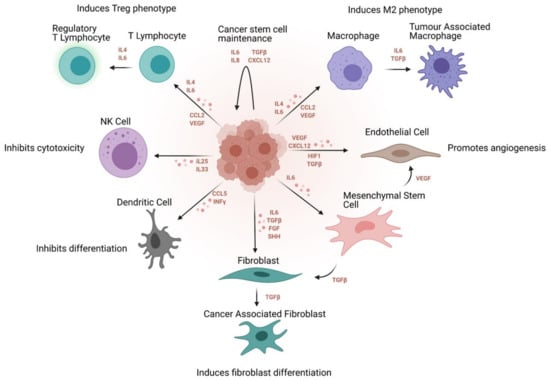 The tumour microenvironment has been linked to chronic inflammation producing cytokines and pro-angiogenic signals which in turn initiate a cascade of immune responses. Immune signaling in the microenvironment, as outlined previously, feeds back into enrichment and maintenance of the stem cell niche, and this aspect will be discussed in further detail.