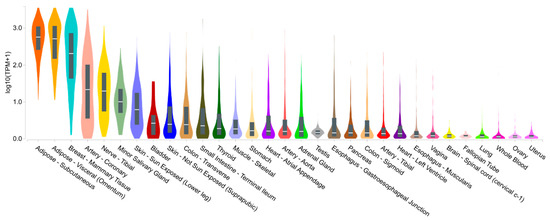 Gene expression of adiponectin—ADIPOQ (ENSG00000181092.9) in human tissues from the Genotype-Tissue Expression (GTEx) portal. The expression values are given in transcripts per million (log10 (TPM + 1)), calculated from a gene model with isoforms collapsed to a single gene. No other normalization steps were applied. Box plots are shown as median and as 25th and 75th percentile. Only tissues with the median TPM > 0.1 are presented.