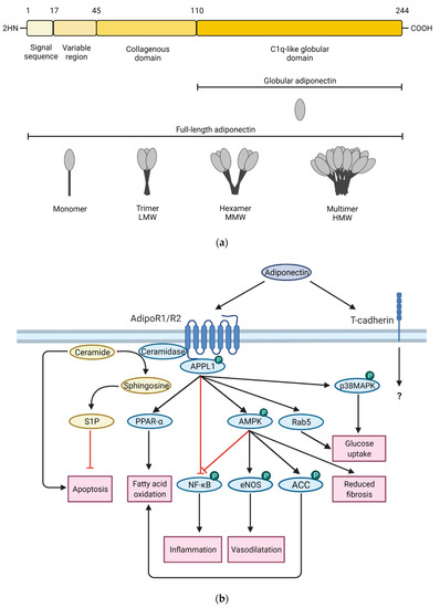 (a) Adiponectin structure and isoforms. (b) Simplified adiponectin downstream signaling. ACC: Acetyl-CoA carboxylase, AMPK: AMP-activated protein kinase, APPL1: adaptor protein, phosphotyrosine interacting with PH domain and leucine zipper 1, eNOS: Endothelial NOS, NF-Κb: Nuclear factor-κB, p38MAPK: p38 mitogen-activated protein kinase, PPAR-α: Peroxisome proliferator-activated receptor α, S1P: sphingosine-1-phosphate.