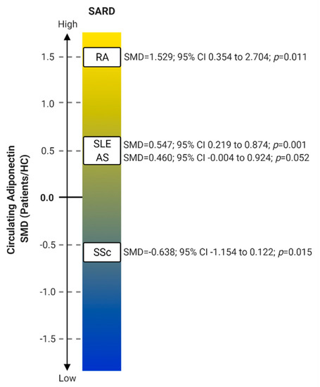 Systemic autoimmune rheumatic diseases (SARDs) are heterogeneous disorders with prominent autoimmune dysregulation leading to multiorgan involvement and varying degrees of inflammation. Their etiology is unknown, but a genetic predisposition has been found [22,23]. SARDs include RA (the most frequent disease), connective tissue diseases such as systemic lupus erythematosus (SLE), Sjögren’s syndrome (SS), systemic sclerosis (SSc), and antiphospholipid syndrome (APS). Since there is no cure for these diseases, long-term pharmacotherapy is required and significant morbidity and mortality are observed. There are many studies focusing on adiponectin serum levels in various SARDs. The general circulating values calculated in meta-analyses of some of these are presented in Figure 3.