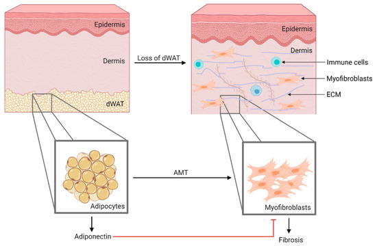 Skin fibrosis is usually accompanied by a consistent decrease in dermal white adipose tissue (dWAT), an important source of adiponectin. The SSc patient skin biopsies showed a reduction in adipocyte number and size, as well as dWAT replacement by a fibrous matrix. This caused a local decrease in adiponectin synthesis, which resulted in the loss of its inhibitory signals on fibroblasts, allowing their activation into myofibroblasts. Adipocytes may be an important source of myofibroblasts as they are capable of undergoing adipocyte mesenchymal transition (AMT) (Figure 4). In this process, adipocytes lose expression of their distinct markers and begin to express myofibroblast markers, such as α-SMA, suggesting that they actively contribute to the extensive accumulation of extracellular matrix components that lead to fibrosis [21,99].