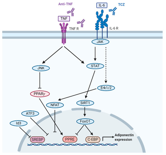 Janus kinases (JAKs) are enzymes transducing pro-inflammatory cytokine signals in cells, which contribute to an immune or inflammatory response in the cell. Their inhibition therefore leads to anti-inflammatory effects [142]. Baricitinib, a JAK 1/2 inhibitor, has been recommended for RA patients who do not respond to initial treatment with MTX or other conventional synthetic DMARDs [132]. In a recent study published on RA, adiponectin levels decreased significantly in patients treated with baricitinib monotherapy at 4 mg/day (n = 11) or in combination with other DMARDs (n = 4) for 6 months. The decrease in systemic inflammation was observed but not studied for adiponectin association [143].
