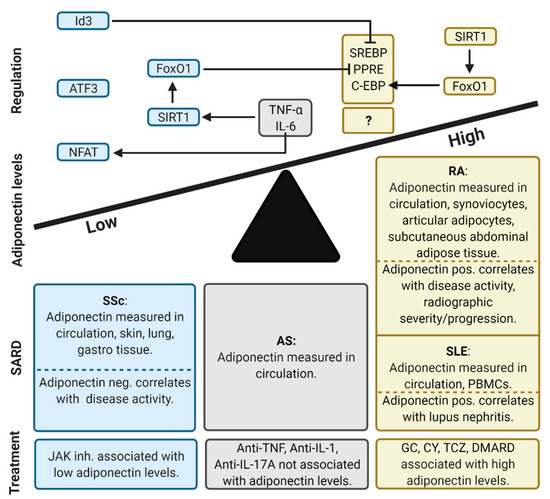 In summary, circulating adiponectin levels are higher in RA and SLE, lower in SSc, while in AS patients the increase is not statistically significant. Due to a lack of studies and inconsistent results, the levels in SS, PsA and APS are still not well defined. Serum adiponectin in RA is positively associated with clinical manifestations, such as disease activity, radiographic severity and progression, poorer bone outcomes and reduced muscle mass. Negative associations are seen in SSc with disease activity and in AS with spinal radiographic disease progression. The role of adiponectin in CVD is not clear, there are studies that link adiponectin to increased mortality in CVD [2], and studies that report of its vasoprotective role [13]. A positive correlation of adiponectin with atherosclerotic plaques in SLE was found, which places SLE along studies reporting unfavorable adiponectin CVD effects. Unexpectedly, the association with CVD is not clear in RA. In general, adiponectin levels in the disease-affected tissues and cells reflect the levels in the bloodstream. Adiponectin is strongly expressed in RA synoviocytes and articular adipocytes, also levels in synovial fluid are associated with disease activity. The concentrations in urine strongly correlate with lupus nephritis in SLE, while in SS it is strongly expressed in the salivary gland, and normalized salivary levels correlate with dry mouth. In SSc, adiponectin expression is reduced not only in serum, but also in organs such as the skin, lung and gastroscopic sample tissue with less adiponectin present in the dcSSc subset with poorer clinical outcomes.