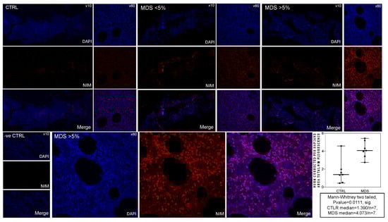 2.2. MDS BM Shows Increased Intracellular NIM-IDC Accumulation That Positively Correlates with MDS Severity