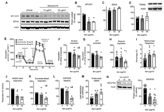 Mito-nuclear protein imbalance and mitochondrial complex I dysfunction in H9C2 cardiomyoblasts exposed to doxycycline. H9C2 cardiomyoblasts were exposed to doxycycline at 0, 10 or 30 μg/mL for 72–96 h. (A) Western blot showing protein expression of mitochondrially-encoded cytochrome c oxidase I (MT-CO1) and nuclear-encoded succinate dehydrogenase complex, subunit A (SDHA). Actin was used as a loading control. (B) MT-CO1 protein content (normalized to vehicle) was significantly lower in doxycycline-treated cells. (C,D) SDHA and TOM20 protein content is unaffected by doxycycline. (E) Typical Seahorse run with injections of oligomycin, carbonylcyanide-4-(trifluoromethoxy)-phenylhydrazone (FCCP), antimycin A and rotenone highlighted. (F–H) Routine, oxygen consumption used for ATP production (Routine-Leak respiration) and maximal respiration was reduced in doxycycline-treated cells. (I) Normalized leak respiration (i.e., Leak / Maximal respiration) was higher in both concentrations of doxycycline. (J) Mitochondrial complex I-stimulated respiration (with substrates pyruvate and malate) was significantly reduced in cells exposed to 10 or 30 µg/mL doxycycline compared to vehicle. (K) Complex II-stimulated (with succinate and rotenone) was only reduced at 30 µg/mL doxycycline compared to vehicle or low dose doxycycline. (L) Oxidative phosphorylation (OXPHOS) capacity (with pyruvate, malate and succinate) dose-dependently decreased following doxycycline exposure, note that panel H shows maximal uncoupled respiration. (M) Relative leak respiration (after oligomycin) with complex I substrates showed increased proton leak from complex I at 30 µg/mL doxycycline. No differences were observed with other substrates. (N) Western blot analysis revealed a large reduction in protein content of nuclear-encoded mitochondrial complex I subunit NDUFS3 in doxycycline-treated H9C2 cells. Bar graphs are expressed as mean±SEM. *: p < 0.05 vs. vehicle, one-way ANOVA followed by Tukey’s post-hoc test for multiple comparisons, #: p < 0.05 vs. 10 µg/mL doxycycline. ⊺: p = 0.088 vs. 10 µg/mL doxycycline.