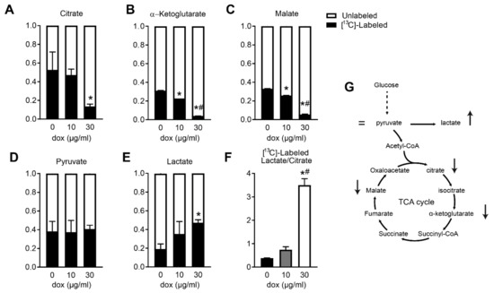 Since we observed a lower oxygen consumption used for ATP production, we performed 13C fluxomics using stable isotope-labeled [13C6]-glucose, and measured the concentrations of intermediary metabolites to further establish the consequent metabolic adaptations. We observed that H9C2 cardiomyoblasts exposed to doxycycline displayed reduced incorporation of labeled glucose into various tricarboxylic acid (TCA) cycle intermediates (Figure 2A–C). Incorporation into pyruvate, which forms the branch point between glycolysis and the TCA cycle, did not change (Figure 2D). As pyruvate can be converted to lactate in the cytosol through anaerobic glycolysis, synthesis of intracellular labeled [13C3]-lactate levels dose-dependently increased upon doxycycline exposure (Figure 2E). The metabolic switch from mitochondrial oxidative metabolism towards glycolysis (ratio labeled lactate and labeled citrate) was markedly increased especially after high-dose doxycycline (Figure 2F,G). These data indicate that doxycycline resulted in less glucose contribution into TCA cycle intermediates, but more production of lactate, the end-product of glycolysis.