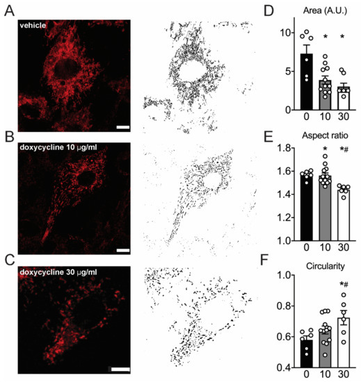In a healthy situation, mitochondria form a reticulum that allows OXPHOS to function optimally. Conversely, mitochondrial stress often leads to mitochondrial fragmentation [12,26]. Therefore, we tested whether mitochondria retained their network structure after doxycycline treatment. Mitochondria in live H9C2 cardiomyoblasts were imaged with the dye TMRM, and appeared more fragmented in doxycycline-treated cells (Figure 3A–C). Quantification of these ultrastructural changes indicates that mitochondrial area in untreated cells was significantly larger compared to doxycycline (Figure 3D). In accordance, the aspect ratio was lower and the circularity was higher in doxycycline-treated cells (Figure 3E–F). These data are consistent with the observation of a fragmented mitochondrial network in doxycycline-treated H9C2 cardiomyoblasts.