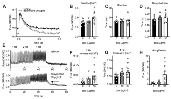 Cytosolic Ca2+ signals were recorded as previously described [27]. Adult Wistar rats (~300 g; Charles River) were anaesthetized by isoflurane inhalation and killed by heart removal. Ventricular cardiomyocytes were isolated by enzymatic dissociation, and plated on laminin-coated dishes (MatTek Corporation, Ashland, MA, USA) for 1 h in M199 medium (PAA laboratories, Pasching, Austria) supplemented with 100 μg/mL ampicillin, 100 μg/mL carbenicillin and 5% fetal bovine serum (FBS). Cells were kept in culture for 2 days in M199 medium supplemented with 100 μg/mL ampicillin, 100 μg/mL carbenicillin, and insulin transferrin selenium (ITS; 0.2%), in increasing concentration doxycycline: 0, 10, or 30 μg/mL. On day 2, cardiomyocytes were loaded with 1 µM Fura-2 acetoxymethyl ester (Fura-2 AM, Life Technologies, Bleiswijk, The Netherlands) in Tyrode’s solution, containing NaCl (133.5 mM), KCl (5 mM), MgSO4 (1.2 mM), HEPES (10 mM), glucose (11.1 mM) and CaCl2 (1.8 mM; pH 7.4), for 15 min at room temperature, washed, and left for de-esterification for 15 min. Doxycycline was removed from the medium due to its interfering effects on fluorescence signals [52], and is known to be a calcium (and iron) chelator. A dual-beam excitation fluorescence photometry setup (IonOptix Corp. Milton, MA, USA), equipped with a HyperSwitch (IonOptix; LLC, Milton, MA, USA) was used for rapid wavelength switching between 340 and 380 nm. Excitation was measured at 510 nm at 250 Hz. The F340/F380 ratio was used as a measure of cytosolic Ca2+ concentration. Experiments were performed in a temperature-controlled dish at 37 °C equipped with platinum stimulation electrodes, filled with Tyrode’s solution. Bipolar pulses at 1 Hz were used for electrical field stimulation. Data were averaged per well to account for a different number of experiments performed per well and condition.To assess the arrhythmogenic potential of doxycycline, we first stressed other cardiomyocytes with a 2 Hz stimulation protocol for 20 s followed by 20 s at 4 Hz, and a resting period of 30 s. Cells were excluded from further analysis when they were arrhythmic before the start. Irregularities in contractions during the bout of 2 and 4 Hz, as well as the resting period, were confirmed by increased cytosolic calcium concentrations (such as calcium waves) and were counted during this fixed time.
