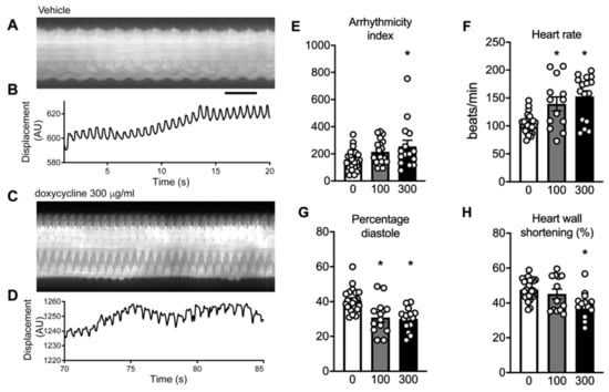 To extend these findings to an in vivo model for cardiac function, Drosophila melanogaster were exposed to low and high doses of doxycycline (100 and 300 μg/mL respectively; similar as used before [12]), and cardiac heart wall contractions were visualized in prepupae (Figure 5A–D). We observed a markedly higher arrhythmicity index after exposure to high doxycycline concentrations, with intermediate values for the low doxycycline concentration (Figure 5E). This increased arrhythmicity index confirmed the arrhythmogenic substrate of doxycycline. Moreover, doxycycline dose-dependently increased basal heart rate (Figure 5F), and concomitantly, the time for diastole and systole were significantly shorter after doxycycline (data not shown). Moreover, the relative time of diastole in the heart period was shortened after doxycycline exposure (Figure 5G). These results indicate a reduced filling capacity of the heart tube. Finally, the displacement of the heart wall between systole and diastole significantly reduced at high doxycycline concentration (Figure 5H), indicating that doxycycline also impaired systolic function.