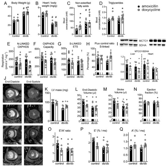 Doxycycline impairs cardiac mitochondrial bioenergetic function, and results in diastolic dysfunction, which was exacerbated in diabetic animals. (A,B) body and heart weights of control (db+) and diabetic (db/db) mice. (C) Fasted non-esterified fatty-acid concentrations were higher in db/db compared to control animals and were significantly higher after doxycycline in control. (D) Triglyceride concentration was significant higher after doxycycline exposure in both animal models. (E) NADH (complex I)-linked oxidative phosphorylation (OXPHOS) was significantly lower in normal animals, but was reduced to a larger extent in db/db animals. (F) Maximal OXPHOS with complex I (NADH-linked) and complex II (succinate) substrates was significantly lower in doxycycline-treated animals compared to amoxicillin-treated animals. (G) Maximal succinate-driven complex II respiration with rotenone tended to be lower after doxycycline treatment (P = 0.06). (H) Normalized respiration (flux control ratio; FCR) for succinate-linked respiration increased in db/db animals treated with doxycycline, but not in healthy animals, FCR for NADH-linked respiration tended to be lower in db/db animals, but not in healthy animals (P = 0.15, not shown). (I) The protein ratio of MTCO1/SDH was lower in the liver, but not in the heart, after doxycycline exposure in both animal models. (J) Representative examples of short axis MRI scans at mid-heart during the end-diastole (left) and end-systole (right). (K) Left ventricular (LV) mass was lower in db/db animals and doxycycline significantly increased LV mass only in db/db animals. (L,M), End-diastolic and stroke volume were lower in control animals exposed to doxycycline, and in db/db animals. (N) Ejection fraction was only marginally, but significantly, lower in db/db animals exposed to doxycycline. (O–Q), Diastolic function (E’/A’) was lower in control animals exposed to doxycycline, due to lower E’ (stiffening of heart wall), and unaltered A’ (atrial function). Diabetic animals already had lower E’/A’ due to lower E’, and doxycycline further lowered E’/A’ due to higher A’. Bar graphs are expressed as mean±SEM. *: P < 0.05 vs. amoxicillin; †: P = 0.06 vs. amoxicillin; +: P < 0.05 vs. corresponding control animal, two-way ANOVA followed by Tukey’s post-hoc test for multiple comparisons.