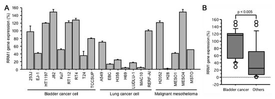 The normalized RRM1 gene expression ratio was evaluated in nine human bladder cancer, six lung cancer, and six malignant mesothelioma cells (Figure 1A). RRM1 gene expression varied from 28.6% (T24) to 153.5% (J82) (median: 116.9%) in bladder cancer cells. Compared to the lung cancer or malignant mesothelioma cell lines, bladder cancer cells showed significantly higher RRM1 gene expression (96.7 ± 8.1% vs. 47.2 ± 10.2%, p < 0.005, Figure 1B).
