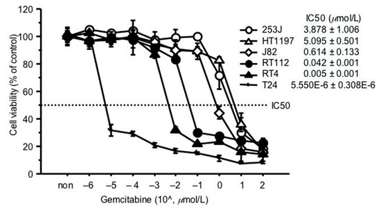 Regarding cell sensitivity to GEM, we performed an MTT assay to investigate the in vitro drug concentration that inhibited cell growth by 50% (IC50). Cancer cell suspensions were seeded in 96-well culture plates at a concentration of 4000 cells/well and incubated at 37 °C. To roughly select the cells resistant to GEM, cells were treated with GEM at different concentrations and cell viability evaluated with the MTT assay, after 72 h. IC50 values were calculated using the formula described by Beck et al. [18]. Two cell lines exhibiting relatively higher resistance, 253J and RT112, were selected for the subsequent study (Figure 2).