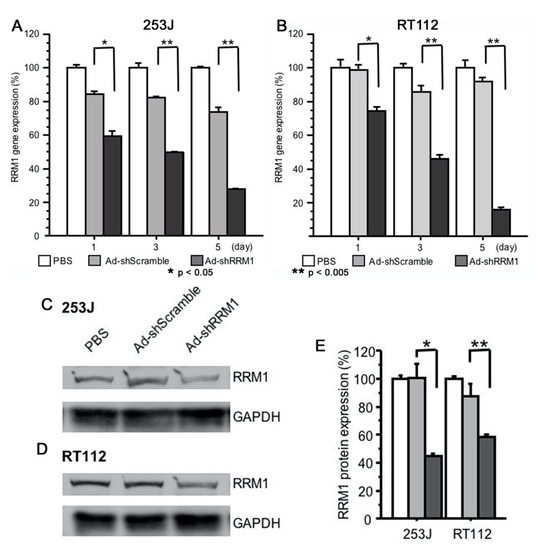 Two RRM1-expressing cells, 253J and RT112, were treated with Ad-shRRM1 at a multiplicity of infection (MOI) of 10. Ad-shRRM1 effectively knocked down RRM1 mRNA and protein expression in both RRM1 highly expressed cancer cell lines, in a time-dependent manner (Figure 3).