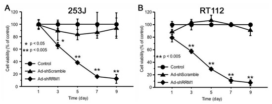 Ad-shRRM1 significantly inhibits cell viability of RRM1-expressing bladder cell lines. Cell viability was evaluated by the 3-(4,5-dimethylthiazol-2-yl)-2,5-diphenyltetrazolium bromide (MTT) assay after transduction with adenoviral vectors at MOI = 10 at series time point of 1, 3, 5, 7 and 9 day. (A) results in 253J cells; (B) results in RT112 cells. (MOI: multiplicity of infection; * p < 0.05, ** p < 0.005 vs. Ad-shScramble treatment).