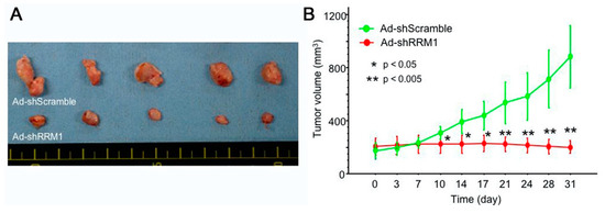 The effects of Ad-shRRM1 on bladder tumor growth were evaluated in vivo using RT112 xenografts in nude mice. The tumor volumes at 31 days were 901 ± 476 mm3 in the Ad-shScramble-treated group and 197 ± 65 mm3 in the Ad-shRRM1-treated group (Figure 5A). The tumor volume in the Ad-shRRM1-treated group decreased significantly from 10 days after injection, compared to the tumor volume in the Ad-shScramble-treated group (Figure 5B). These results further confirmed the antitumor effect of Ad-shRRM1 in vivo.