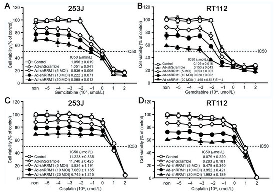 In addition to inhibiting cell viability, we proved in this study that Ad-shRRM1 can increase cell sensitivity to GEM. Ad-shRRM1 inhibited the 253J and RT112 cell proliferation in a dose-dependent manner. The cell viability was 86.9 ± 1.2%, 77.5 ± 3.5% and 68.2 ± 1.6% for the 253J infected with Ad-shRRM1 at 5, 10, and 20 MOI 4 day after infection (Figure 6A). The cell viability was 87.7 ± 1.5%, 74.6 ± 4.1% and 58.0 ± 0.7% for RT112 cell infected with Ad-shRRM1 at 5, 10, and 20 MOI 4 day after infection (Figure 6B). Double increase in Ad-shRRM1 exposure resulted about 9% and 12% cell inhibition for 253J and RT112 cell respectively. When in combination with GEM treatment, in case of Ad-shRRM1 exposure at MOI of 20, the sensitivity to GEM (IC50) increased significantly and was 27.5 times higher in 253J cell and 7712 times higher in RT112 cell (Figure 6A,B). On the other hand, no such changes in IC50 were observed in the CDDP treatment groups (Figure 6C,D). Combination therapy with Ad-shRRM1 and GEM specifically induces a synergistic cytotoxicity in RRM1-expressing bladder cancer cells and could achieve the same effect with a reduced dosage of either one of the individual drugs. This would be beneficial in clinical application, as it could result in reduced side-effects experienced by patients.