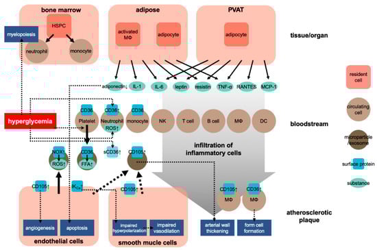 Interestingly, Flynn et al. reported that even in the absence of DM or insulin resistance, the change in glucose level activated the bone marrow, leading to mononucleosis and accelerating atherosclerosis [36]. Meanwhile, transient intermittent hyperglycemia (TIH) caused hematopoietic stem and progenitor cells (HSPC) to proliferate and differentiate in the bone marrow, leading to a rapid expansion of common myeloid and granulocyte-macrophage progenitors and a subsequent white blood cell proliferation. In particular, TIH caused the proliferation of Ly6Chi mononuclear cells, which induce atherosclerosis more strongly than other monocytes. According to Graubardt et al., removing the circulating Ly6Chi monocytes reduces neutrophils that produce reactive oxygen species (ROS) [37], which is one of the critical factors of both DM and atherosclerosis [38]. Other risk factors found in prediabetic obesity, such as inflammation, dyslipidemia, oxidative stress, and signal transduction from adipose tissue macrophages, may also promote the expansion and differentiation of bone marrow HSPCs and, subsequently, leukocytosis [39,40,41].