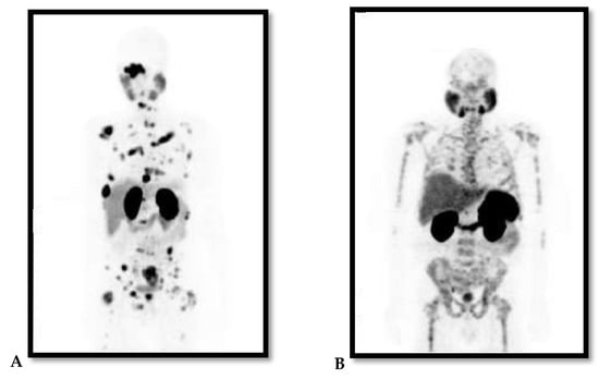PCa is a notoriously heterogeneous cancer with 60–90% of the patients having multiple distinct cancer foci within the prostate gland at time of diagnosis []. The heterogeneity of PCa is also observed through its metastatic predominance for the skeleton with high risk of biochemical recurrence and persistence following treatment, and this correlates with increased morbidity and mortality. This has been illustrated in Figure 1 with 68Gallium(68Ga)-prostate-specific membrane antigen (PSMA)-Positron Emission Tomography (PET) images of two patients with metastatic PCa to the skeleton, which vary in the pattern of bone involvement and histological features. This probes for personalised and targeted therapeutic approach. Most PCa diagnoses and treatments are purely reliant on increased levels of sPSA and androgen hormone (AH), which is highly detectable in localised PCa and certain cancer cells. This makes advanced or aggressive PCa such as metastatic hormone-refractory PCa (mHRPC) with suppressed levels of PSA or AH difficult to diagnose and treat []. When diagnosed early especially at the local stage with well-differentiated non-metastatic disease, the 5-year relative survival rate of PCa is >95% as observed in more than 3000 patients with a new diagnosis recorded in the Norwegian PCa Registry in 2004–2005 []. PCa is classified into low, intermediate and high-risk groups, and this based on TNM stage that describes the amount and spread of cancer in patient’s body, Gleason score and level of PCa marker called sPSA [,].
