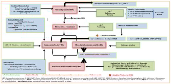 Clinical disease progression, pathophysiology and current therapeutic interventions of prostate cancer. Most PCa patients usually progresses slowly to mHRPC or mHSPC. PCa treatment varies according to stages and pathophysiology of the disease, and these currently include chemotherapy, radiotherapy, surgery and ADT. Various preclinical and clinical trials have been tested for immunotherapy approaches targeting various immune checkpoints although these have demonstrated minimal clinical benefit in PCa especially when used as monotherapies. Bold arrows represent immune checkpoints that can potentially be targeted for therapy. Color codes: pink boxes—clinical disease progression; green boxes—established therapy strategies; blue boxes—novel therapy option.