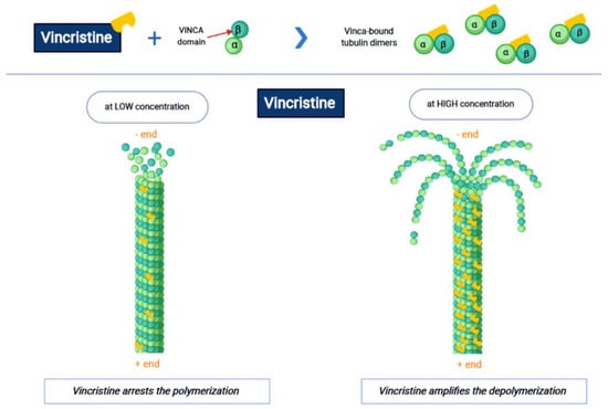 Vincristine acts as an inhibitor of the treadmilling process, by the link to the tubulins, which prevents the formation of the microtubules and consequently of the mitotic spindle. In this way, cell division is blocked and the cell dies [18]. In particular, vincristine and the other VAs interact with tubulin dimers by binding to approximately sixteen–seventeen different specific binding sites, known as the vinca domain [19]. Once the binding site is reached, VAs have a concentration-dependent action: at low concentrations, VAs prevent microtubules from elongating, by binding to the + end and preventing GTP from binding to β-tubulin [20]; at high concentrations, they promote the depolarization of microtubules, as explained in Figure 1.