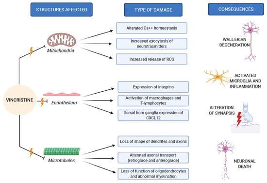 The pathogenesis of VIPN is strictly connected to the mechanisms through which vincristine carries out its antineoplastic function. As previously mentioned, vincristine acts primarily by altering the normal assembly and disassembly function of microtubules, with consequent mitosis block and cell death. In addition to this, all other activities that involve microtubules are inevitably compromised. Inside the neurons, microtubules are not involved in the constitution of the mitotic spindle, since these cells are not in active replication. Microtubules are abundant in neurons, because they make up the skeleton of axons and dendrites, giving them their specialized morphologies [1,25].