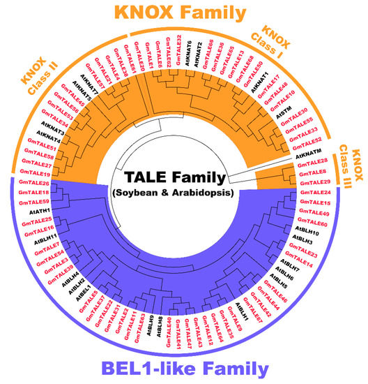 Unrooted phylogenetic tree of three-amino-acid-loop-extension (TALE) proteins in soybean and Arabidopsis. By using MEGA 7.0, the multiple protein sequences in two species were aligned with the MUSCLE method, and the tree was built used the maximum likelihood (ML) method with the best scoring JTT + G + I model. The tree was further categorized into the KNOX and BEL1-like subfamilies. All the GmTALE proteins have been emphasized in red.