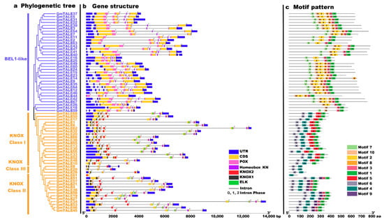 To better illustrate the conserved domain patterns of the GmTALE gene members, we carried out motif scanning by setting the motif amount as 10 with the MEME online software (https://meme-suite.org/meme/tools/meme, accessed on 15 April 2021). The detailed information of the ten MEME-motifs was listed in Table S4. And the Seq Logos of the MEME-motifs were depicted in Figure S1. A diagram was further constructed by the ten scanned MEME-motifs (named Motif 1–10) in Figure 2c. Importantly, GmTALE members within the same subfamily displayed similar motif compositions. Most BEL1-like subfamily members contained Motif 1, 2, 3, 7, 8, and 10, whereas the KNOX subfamily members were associated with Motif 1, 3, 4, 5, 6 and 9. In particular, the different clades of the KNOX subfamily exhibited diverse motif components. The KNOX Class I members contained Motif 1, 4, 5 and 6. By contrast, the GmTALE members in the KNOX Class II were associated with Motif 1, 3, 4, 6 and 9, while the KNOX Class III members were only coupled with Motif 4 and 6. Interestingly, distinct GmTALE members showed different motif constitutions, which paralleled to their conserved domain patterns. Taken together, we summarized the subordinations between conserved domains and the MEME-motifs: Motif 1, 3 and 8 corresponded to the Homeobox_KN domain; Motif 2, 7 and 10 were associated with the POX domain; Motif 5 and 9 were correlated to the ELK domain; Motif 6 was linked to the KNOX1 domain and Motif 4 was correlated to the KNOX2 domain (Table S4).