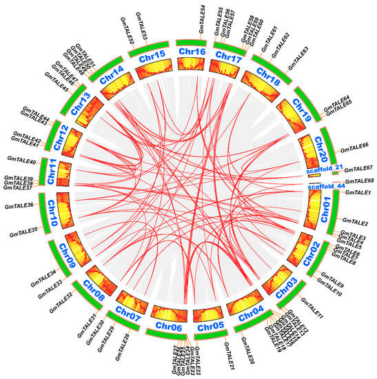 Circos plot displaying the collinearity of GmTALE homologous genes. Genome-wide collinear blocks were set as the background in gray and the duplicated GmTALE gene pairs were linked with red curves. Besides, each soybean chromosome was attached with 300-kb gene density information and depicted by heatmap and wave graph.
