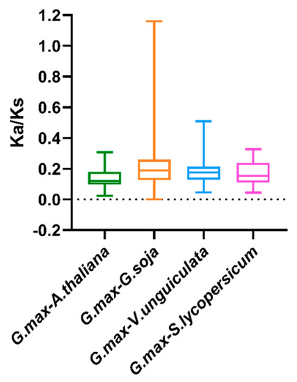 To illuminate the evolutionary constraints acting on the TALE superfamily, the Ka/Ks (non-synonymous substitution/synonymous substitution) ratios of the TALE orthologous gene pairs among soybean and the six species were calculated (Table S7). Moreover, the obtained Ka/Ks ratio values were depicted in the boxplot in Figure 6. Due to the lack of calculated Ka/Ks ratio values, the results among soybean and the two monocots were manually removed from the boxplot. As is shown in Figure 6, most of the orthologous TALE gene pairs displayed Ka/Ks < 1, indicating that the soybean TALE superfamily undergone strong purifying selective pressure during evolution among the dicots [22].