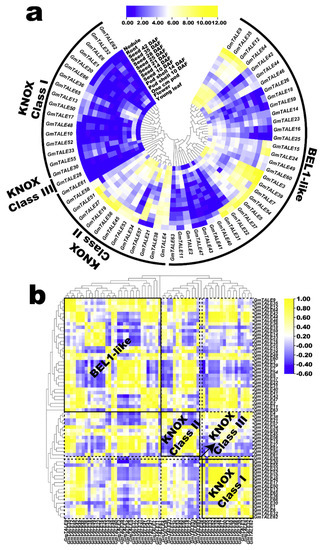 Concomitantly, we calculated the correlation coefficients of the expressed GmTALE genes to further illustrate expression patterns in tissues or organs (Table S12). Then the acquired correlation coefficient matrix was recruited to draw a heatmap that clustered by the phylogeny of the GmTALE members (Figure 8b). To display the expression correlations among diverse clades, the correlation heatmap was divided into different blocks with the dotted lines based on the classification of the GmTALE subfamilies. Furthermore, we enclosed the BEL1-like and KNOX subfamilies with the solid boxes and labeled their names in bold in the heatmap. As a whole, both the positive and negative correlations broadly existed and interlaced among the GmTALE members of internal or external subfamilies. Notably, most GmTALE gene members in the KNOX Class I clade shared similar expression patterns and exhibited positive correlations. Comparably, eight GmTALE gene members (GmTALE3, GmTALE5, GmTALE7, GmTALE22, GmTALE31, GmTALE37, GmTALE39 and GmTALE54) that clustered in one clade of the BEL1-like subfamily were broadly negatively correlated with the GmTALE gene members both internal and external subfamilies, which highlighted their different expression patterns. Overall, the disparity and similarity of gene expression patterns in distinct tissues or organs may manifest the potential regulating roles of the GmTALE genes during soybean plant development.
