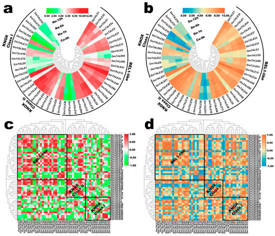 Likewise, the gene expression correlation analyses during saline stress and dehydration were also conducted, and the acquired correlation coefficient matrixes were respectively displayed in Tables S14 and S15. Accordingly, the correlation heatmaps for GmTALE gene expression during saline stress and dehydration were built in Figure 8c,d. In general, positive and negative correlations of gene expression were universally existed and interlaced among the GmTALE members of internal or external subfamilies. However, the gene expression correlation patterns were diverse during the two abiotic stresses. For instance, during saline stress, in the BEL1-like subfamily, GmTALE2, GmTALE16 and GmTALE25 showed broadly negative correlations with most GmTALE members in the BEL1-like subfamily and the KNOX Class II clade compared to those during dehydration. In all, the GmTALE genes distinctly expressed and responded to saline stress and dehydration with different expression patterns.