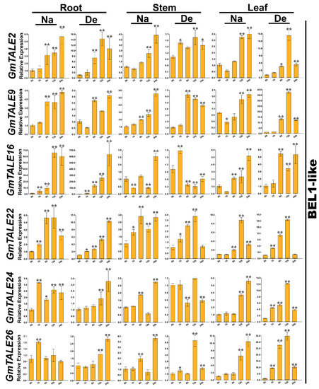 Quantitative RT-PCR analyses of the selected representative GmTALE genes in the BEL1-like subfamily during stress treatments throughout leaf, stem and root tissues. Data were normalized to the GmActin gene, and vertical bars indicated the standard deviations. The values represented the mean ± standard deviation (SD) of three independent replicates. Asterisks indicate the corresponding gene significantly up- or down-regulated compared with the 0-h statuses (* p < 0.05, ** p < 0.01, Student’s t-test). Na: saline stress; De: dehydration.